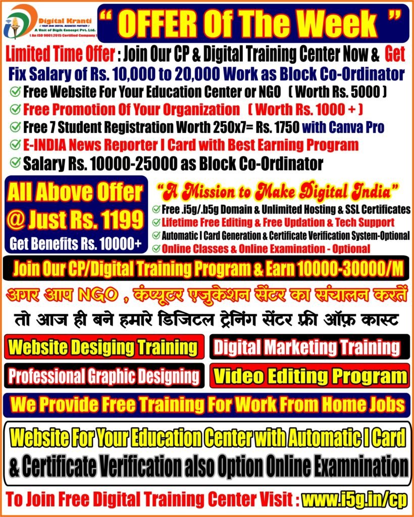 अगर आप समाज सेवी / न्यूज़ रिपोर्टर / NGO संचालक या CSC सेंटर संचालक है और आप हमारे “A Mission to Make Digital India ” के साथ मिलकर आप डिजिटल स्टडी सेंटर व चैनल पार्टनर व Block – Co-Ordinator बनकर अच्छा इनकम प्राप्त करना चाहते हैं तो आज ही संपर्क करें